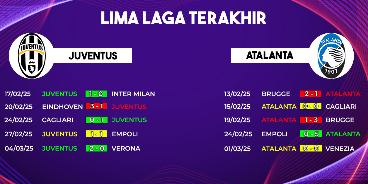 Menariknya, Juventus belum pernah menang dalam enam laga kandang terakhir melawan Atalanta di Serie A. Dengan catatan lima hasil imbang dan satu kekalahan, duel kali ini diprediksi akan berlangsung ketat dan penuh strategi.