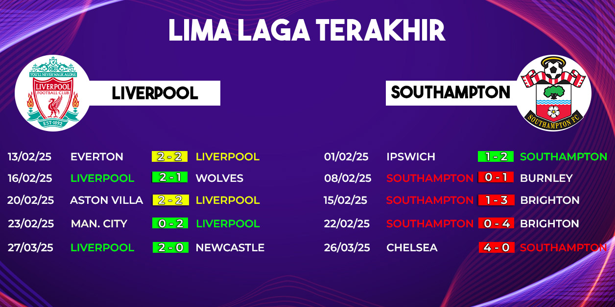 Pada Sabtu, 8 Maret 2025, Liverpool FC akan menjamu Southampton FC di Anfield dalam lanjutan Pekan ke-28 Premier League 2024/2025. Pertandingan Liverpool vs Southampton dijadwalkan kick-off pukul 22.00 WIB dan dapat disaksikan melalui live streaming di Vidio. Laga ini menjadi kesempatan bagi Liverpool untuk memperkokoh posisi mereka di puncak klasemen, sementara Southampton berusaha keluar dari zona degradasi.