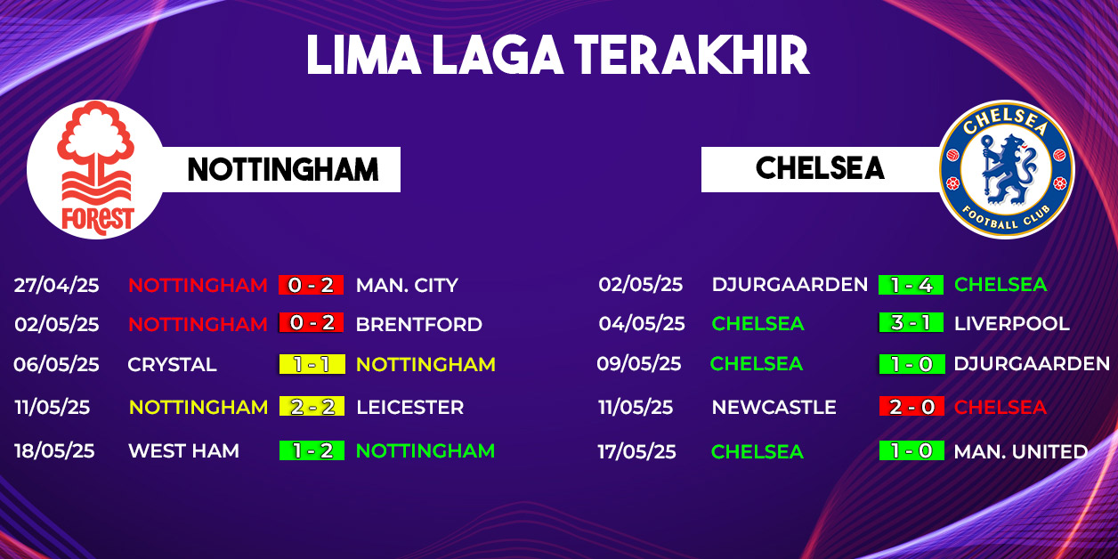Chelsea saat ini duduk di peringkat kelima klasemen sementara dengan 67 poin, hanya terpaut satu angka dari Forest yang menempati posisi ketujuh. Situasi ini menjadikan laga di City Ground sebagai duel berebut nasib Eropa. Bagi The Blues, kemenangan akan memastikan tiket menuju Liga Champions, tanpa perlu menanti hasil dari pertandingan tim lain.