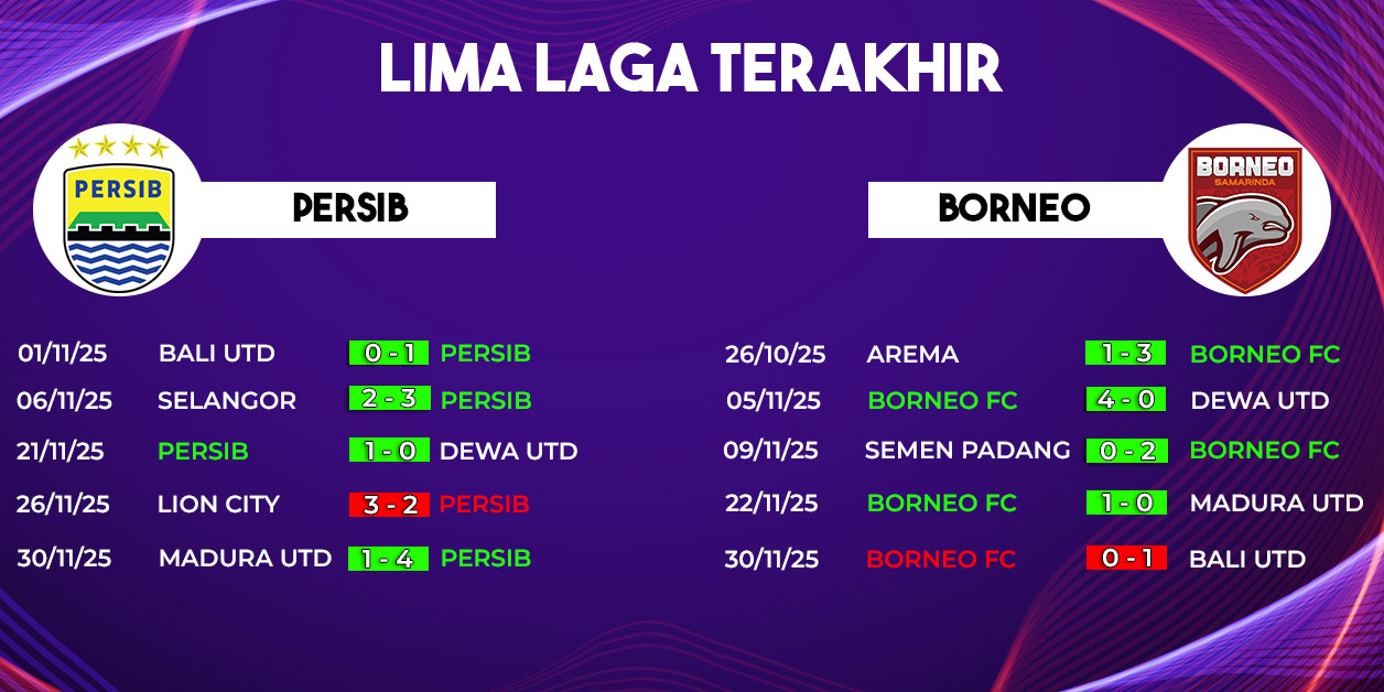 Pertandingan Persib Bandung vs Borneo FC pada laga tunda pekan ke-4 BRI Super League 2025/2026 dipastikan menjadi salah satu duel paling panas pekan ini. Duel yang akan berlangsung di Stadion Gelora Bandung Lautan Api (GBLA) pada Jumat, 5 Desember 2025 pukul 19.00 WIB ini dapat disaksikan melalui Indosiar dan Vidio. Rivalitas kedua tim yang selalu menyajikan tensi tinggi membuat laga ini sangat dinantikan oleh para pecinta sepak bola nasional.