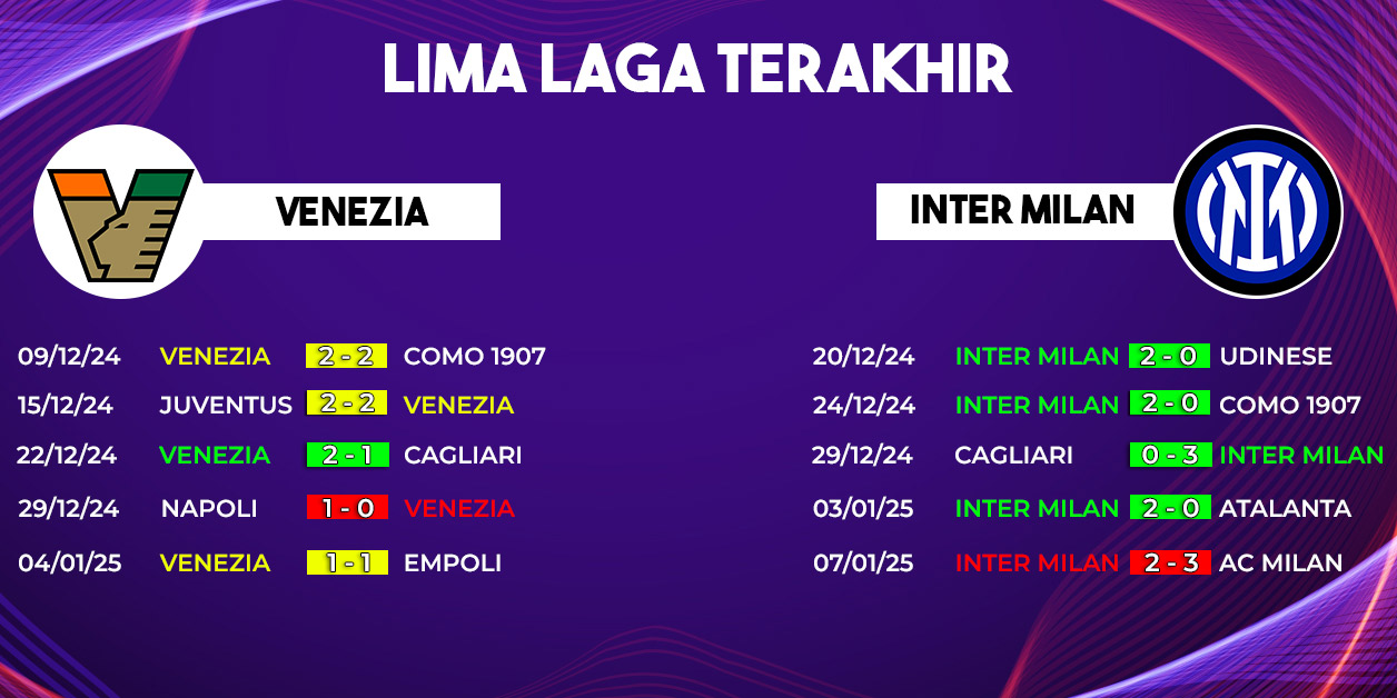 Masih berada di zona degradasi, Venezia menghadapi tekanan besar untuk mengamankan posisi mereka di Serie A. Dalam lima pertandingan terakhir, performa mereka belum cukup konsisten dengan hanya meraih satu kemenangan.